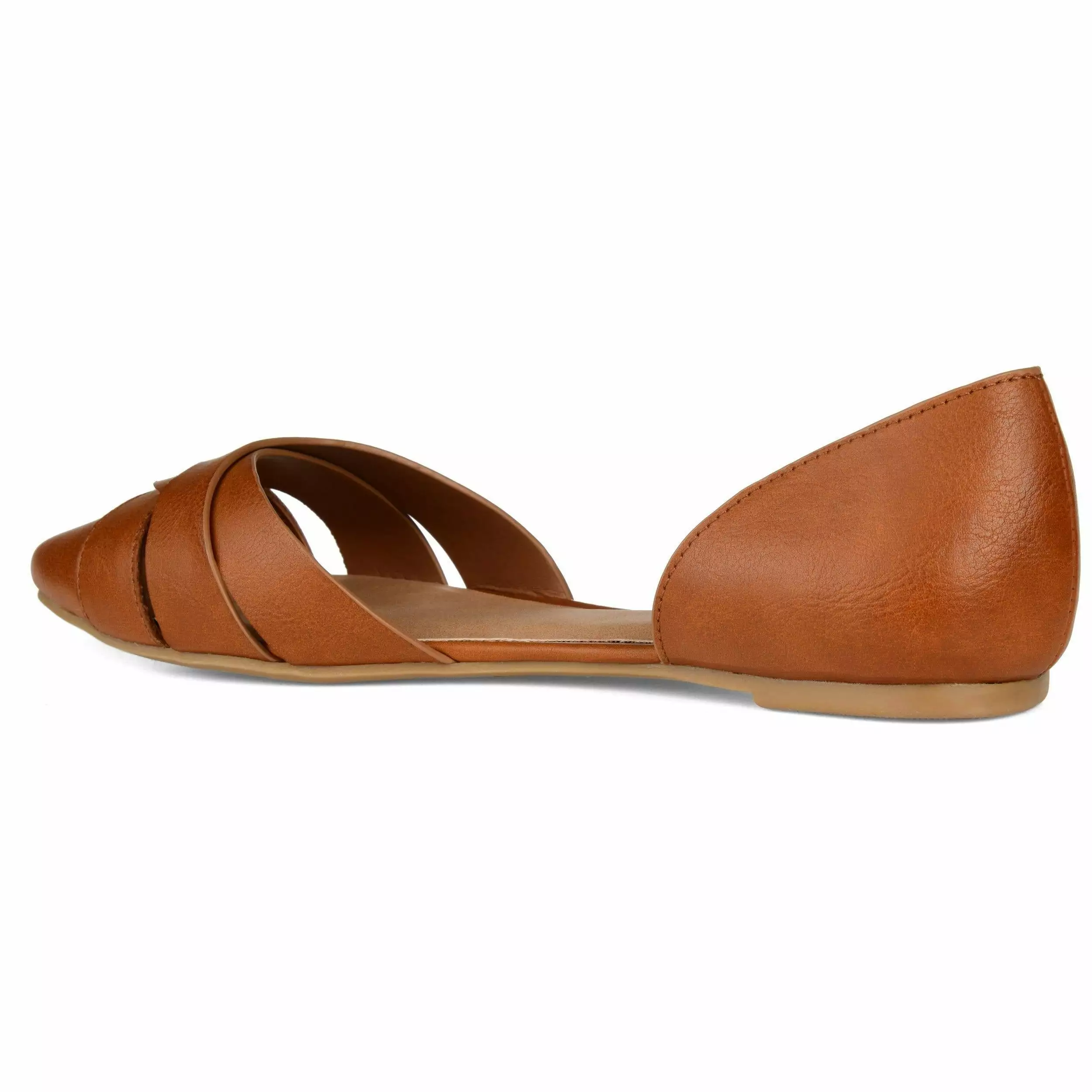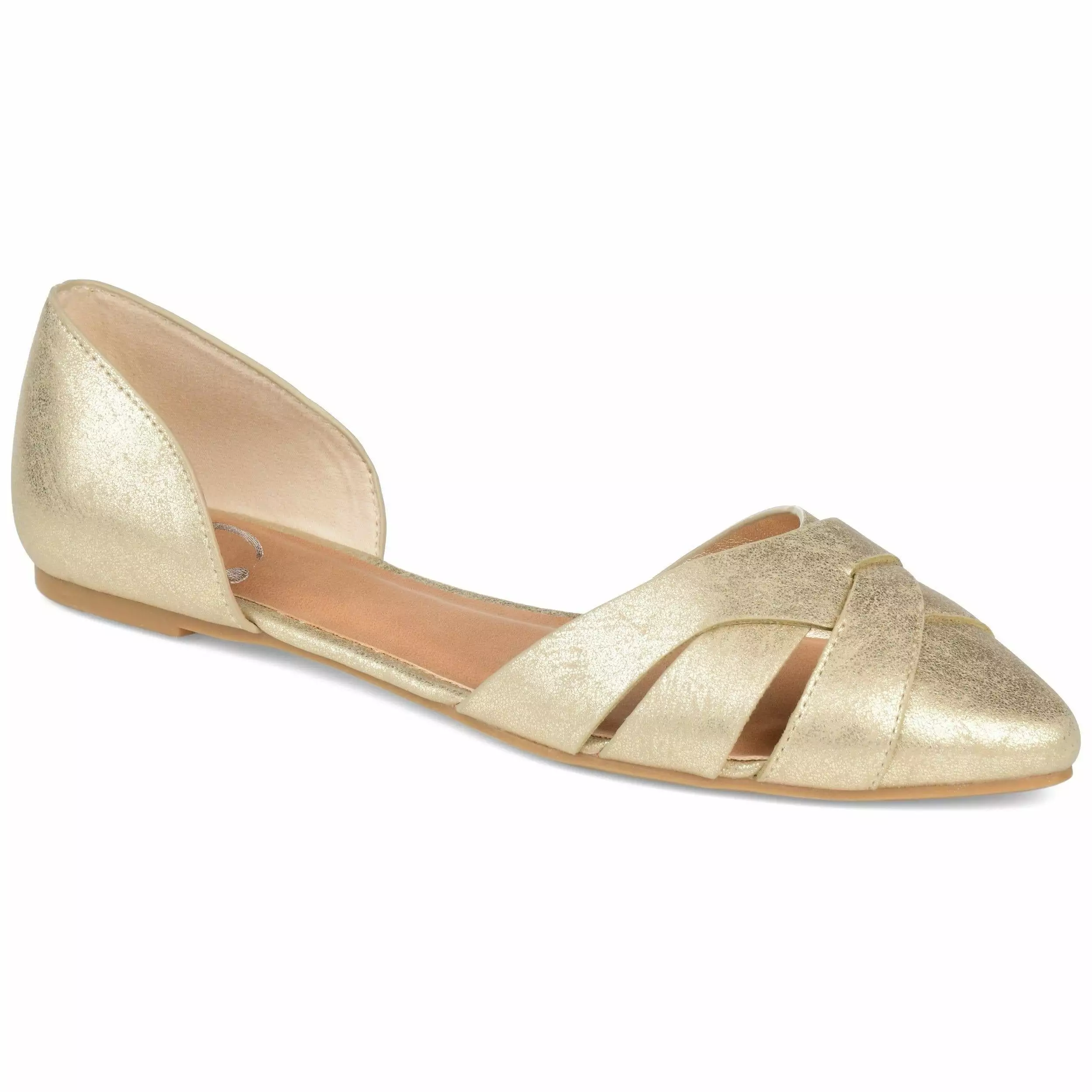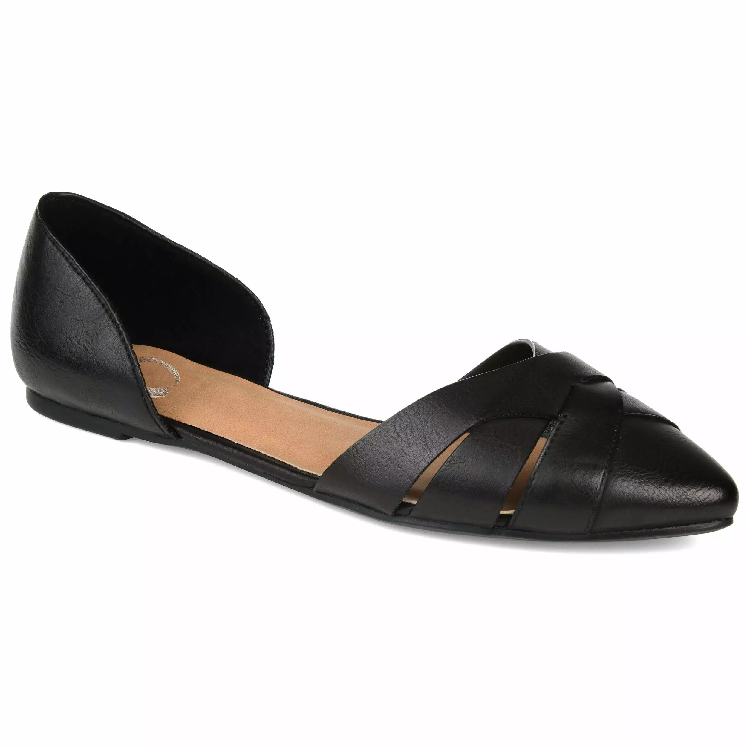 A retro d’Orsay flat with an almond-toe embellished by an open crisscross design. Supple vegan leather uppers and a padded footbed complete this polished yet comfortable look.