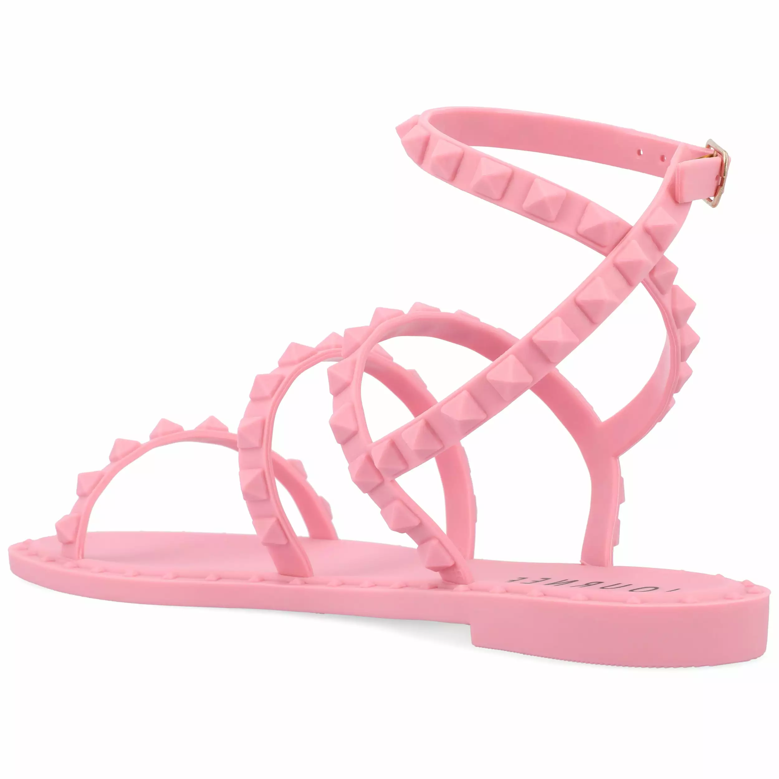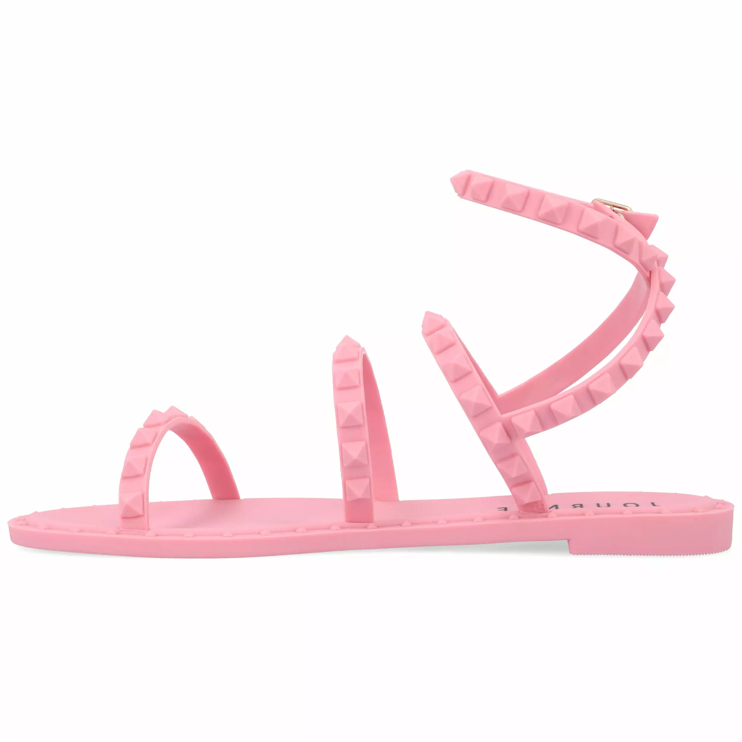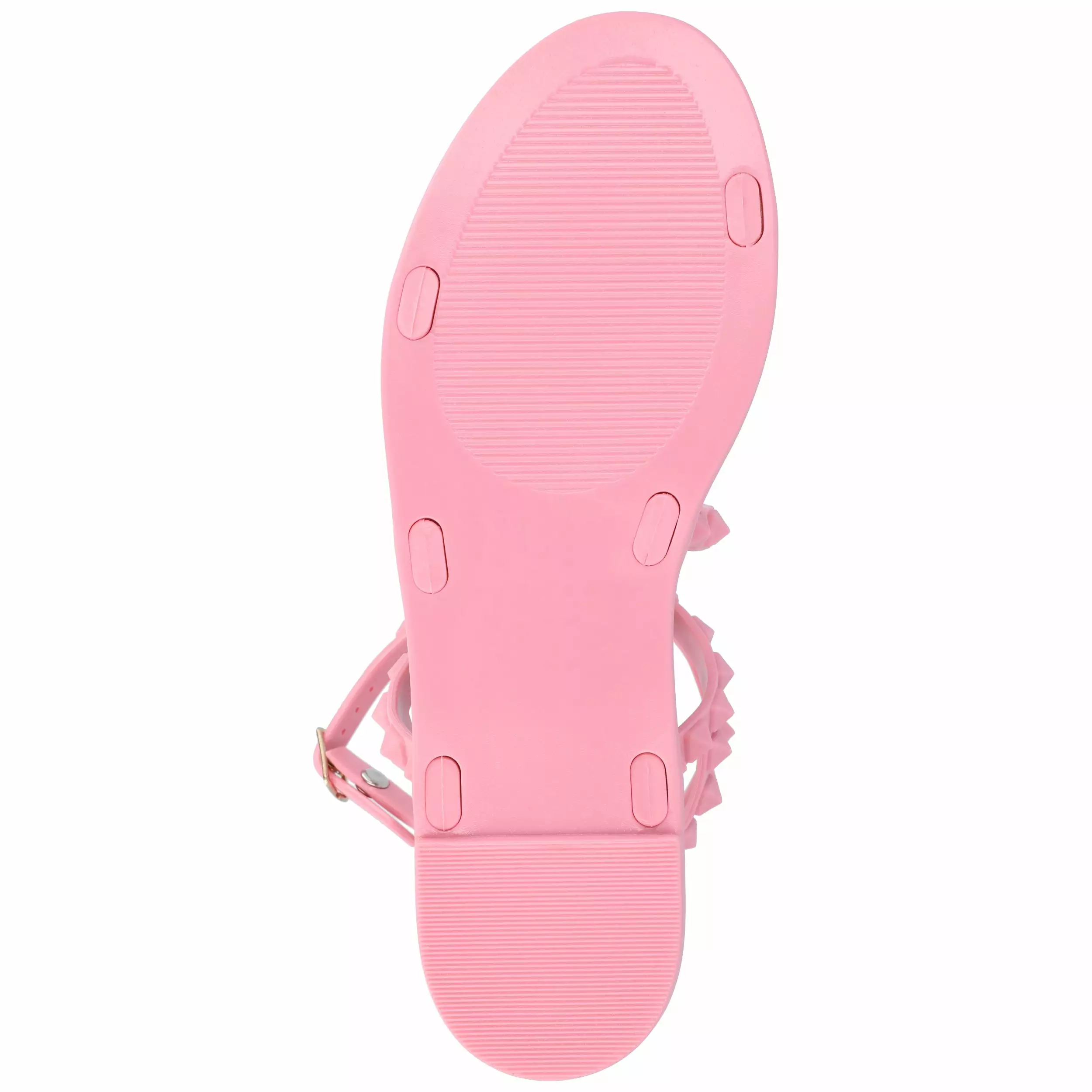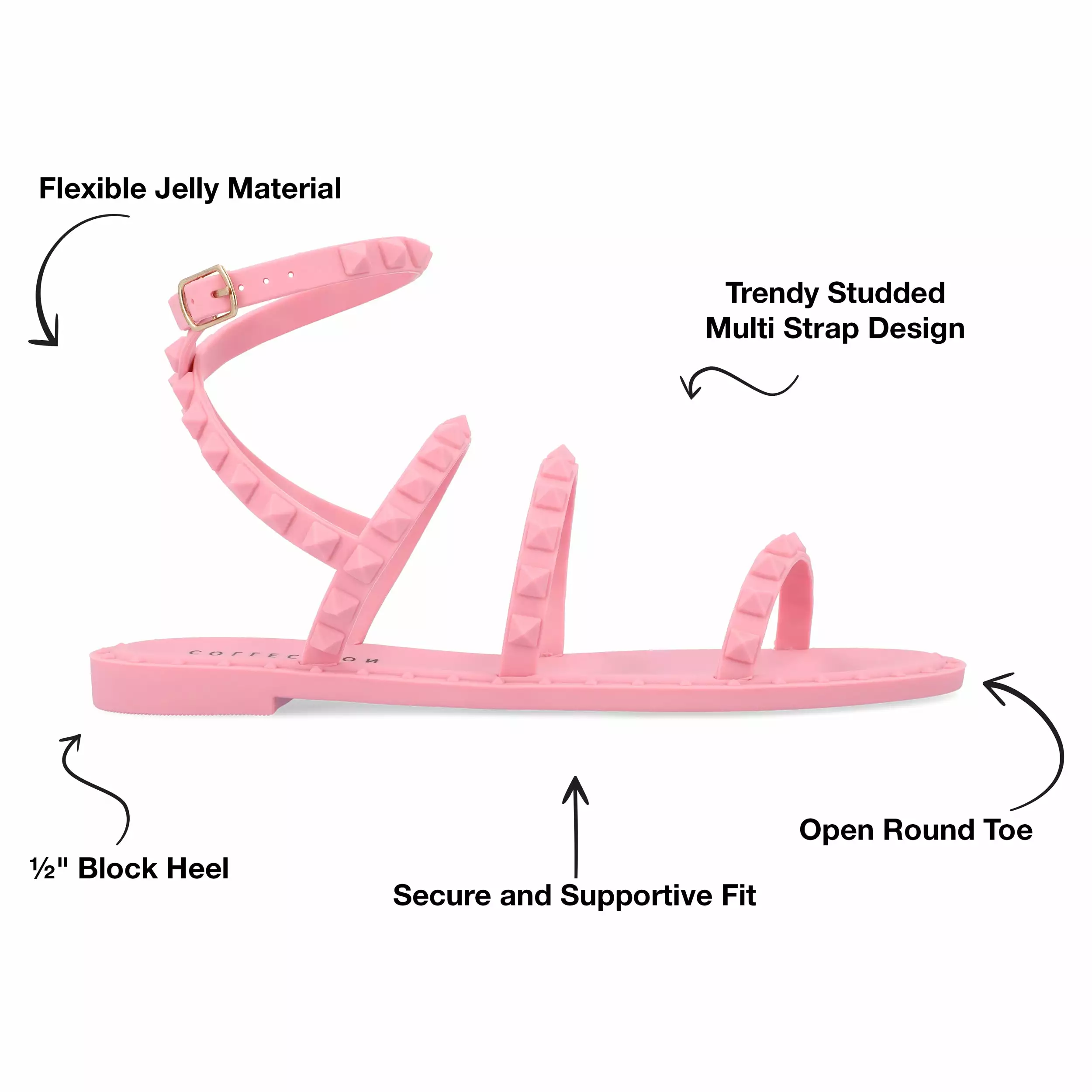 This boldly colored multi-strap sandal is made with flexible jelly for a retro look.